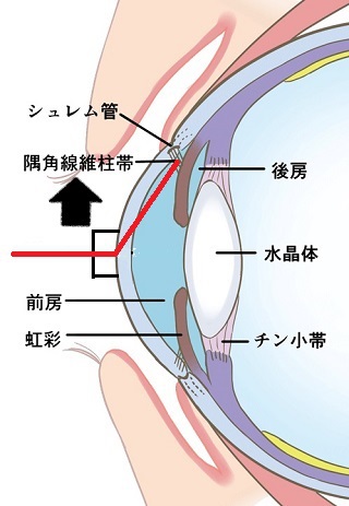 緑内障治療法として、選択的レーザー線維柱帯形成術(selective laser trabeculoplasty,SLT)は以前からありました。 マイクロパルスレーザー(図 赤線)を線維柱帯(図 矢印)に照射し、房水流出抵抗を減らすことで眼圧を下げる治療です。 緑内障点眼薬の中にも房水流出抵抗を減らす目的で使用されているものがあります。